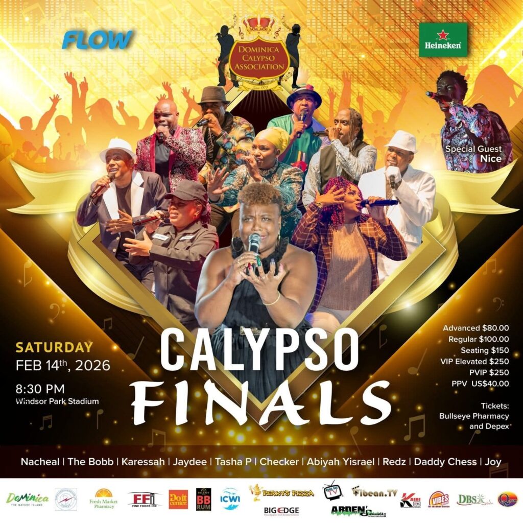 The Calypso Grand Finals will be held at 8.30 pm on Saturday February 14, 2026 at the Windsor Park Sports Stadium, Roseau, Dominica.