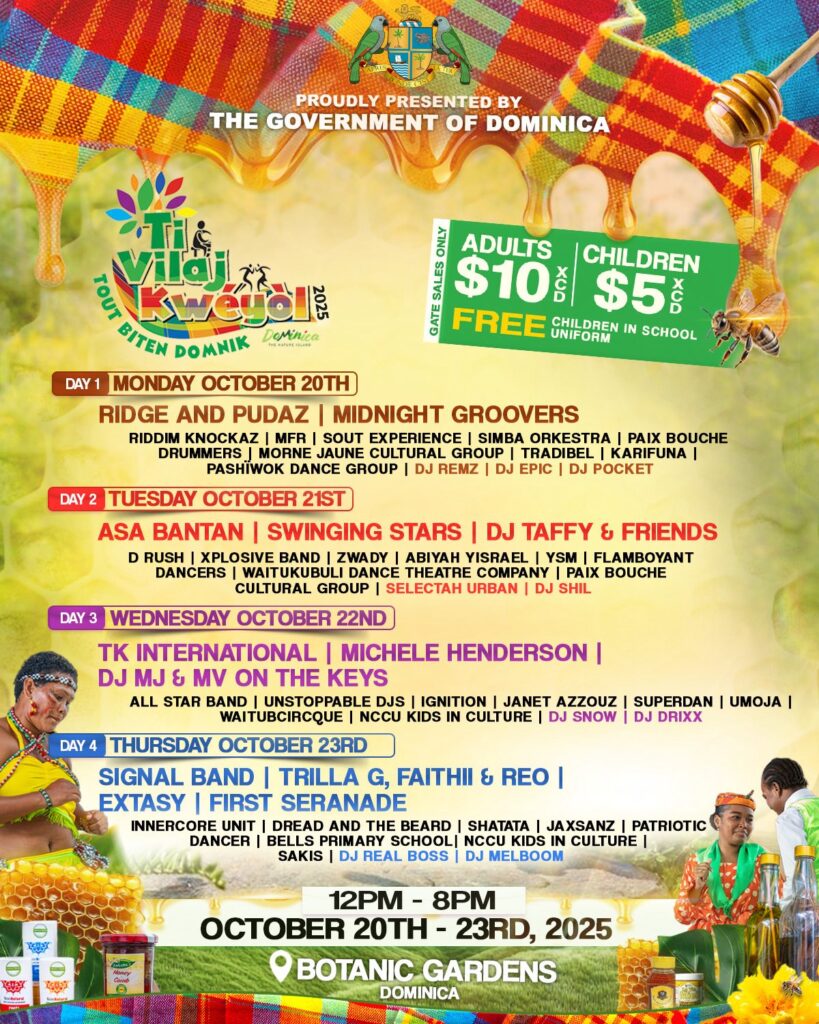 The Ti Vilaj Kwéyòl 2025 calendar of events is October 20-23, 2025, at the Botanic Gardens in Dominica. The event will run daily from 12 PM to 8 PM and will feature local music, culture, food, art, crafts, and a special feature called “The Hive”.